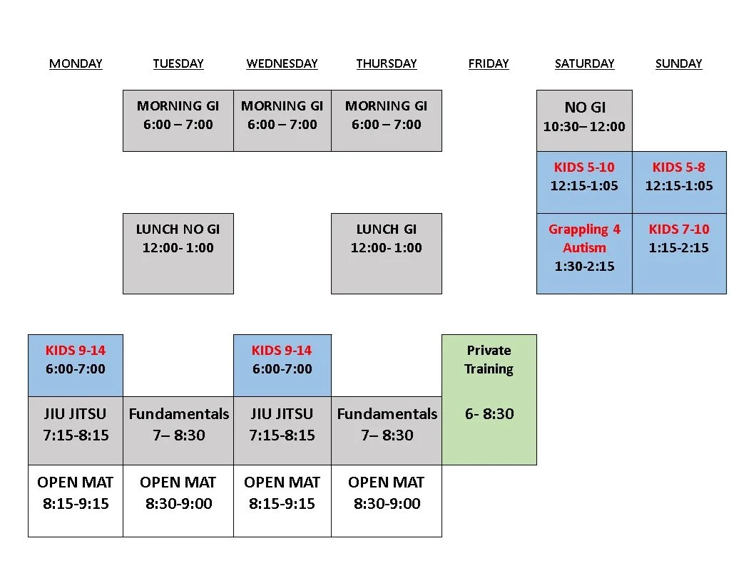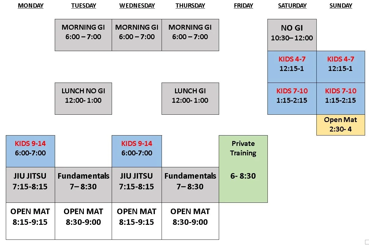 All classes are GI (Kimono) unless specified as No Gi